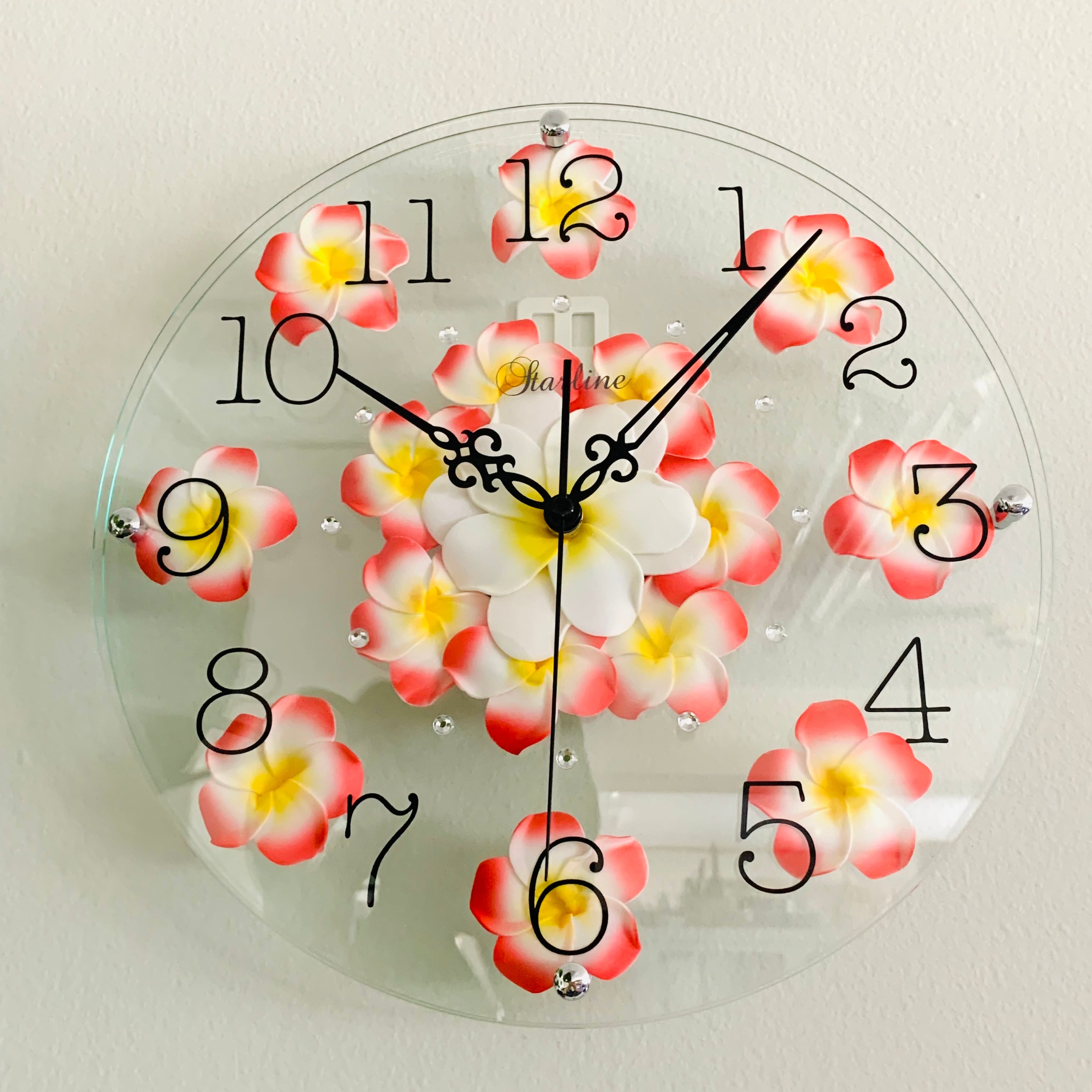 2枚のクリアなガラスにぷっくりと可愛い赤いプルメリアの造花をたくさん挟んだ、おしゃれな掛け時計です。