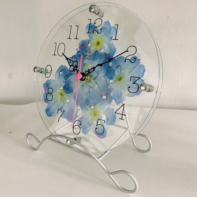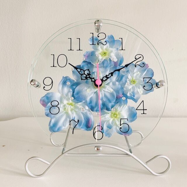 2枚のクリアなガラスにブルーのデルフィニュームの造花を挟んだ、かわいくておしゃれな置き掛け兼用時計です。