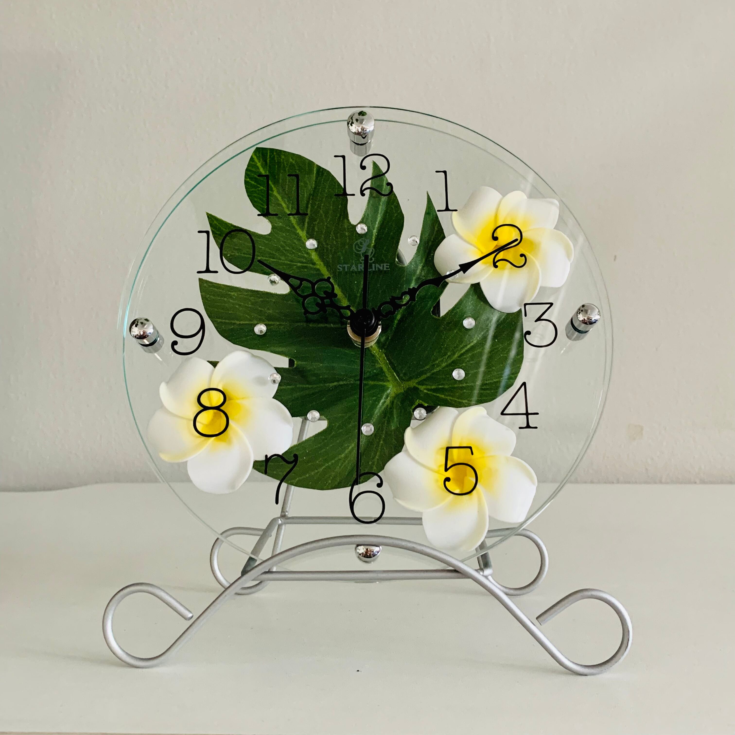 2枚のクリアなガラスにモンステラと可愛い黄色いプルメリアの造花を挟んだ、当店人気のかわいくておしゃれな置き掛け兼用時計です。