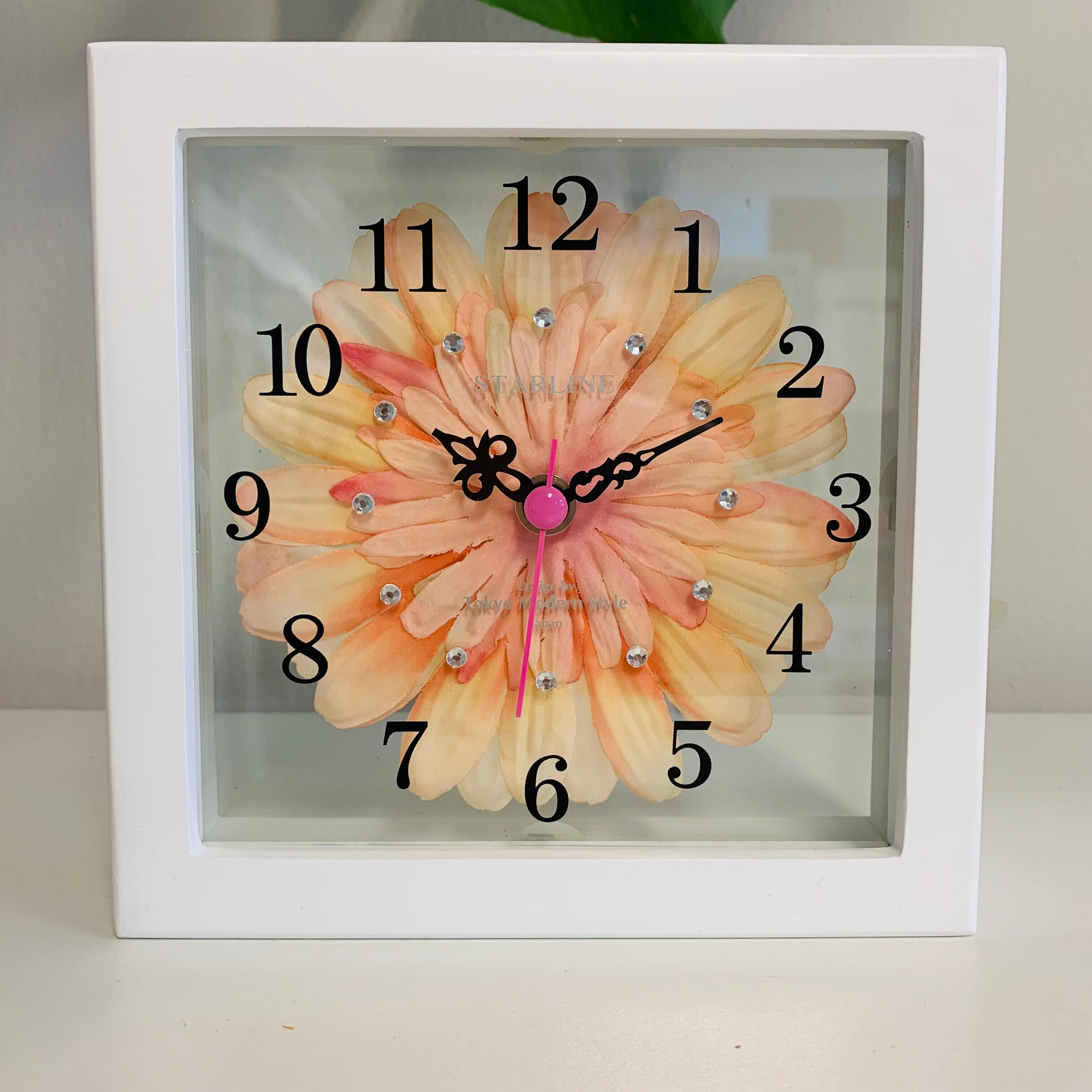 3枚のクリアなガラスにピーチ色のガーベラの造花を挟んだ、かわいくておしゃれな置き掛け兼用時計です。後ろのフックを壁に固定したら、壁掛け時計としてもお使いいただけます。
