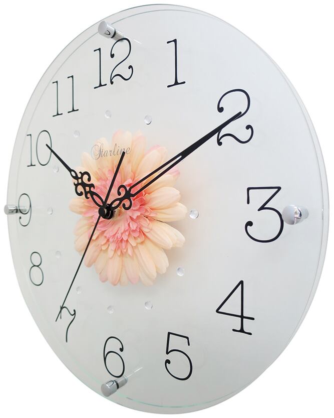 2枚のクリアなガラスにガーベラの造花を挟んだかわいくておしゃれな壁掛け時計です。